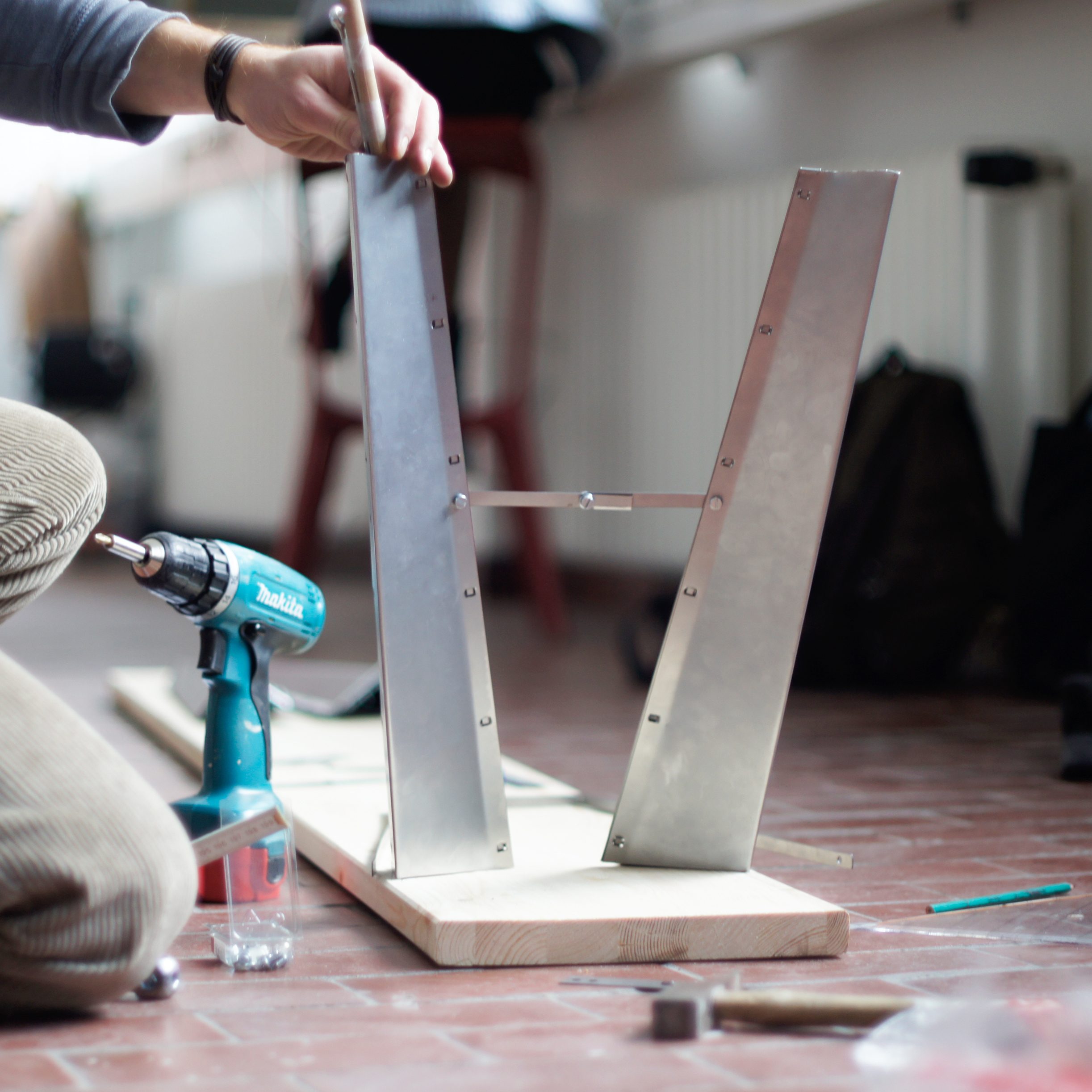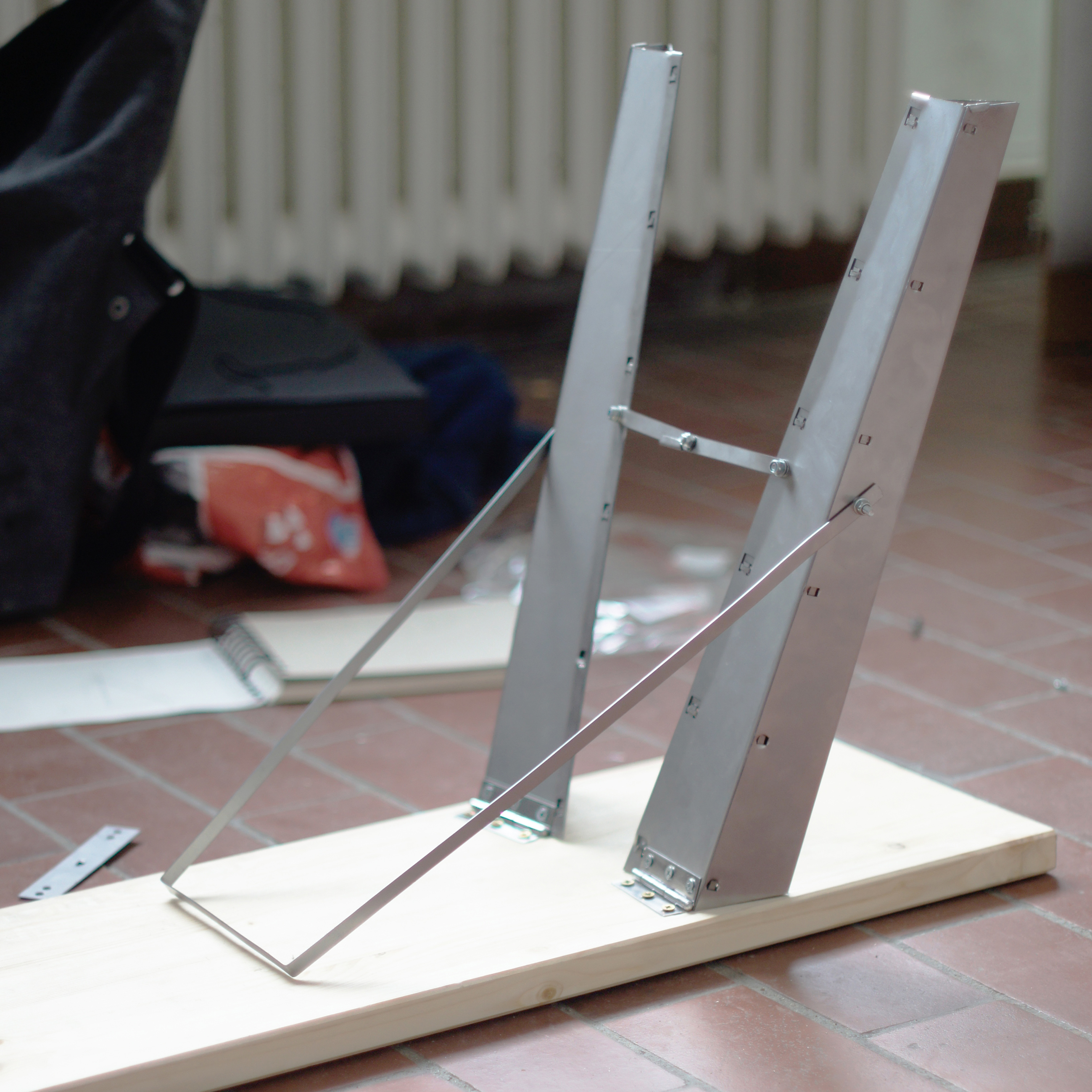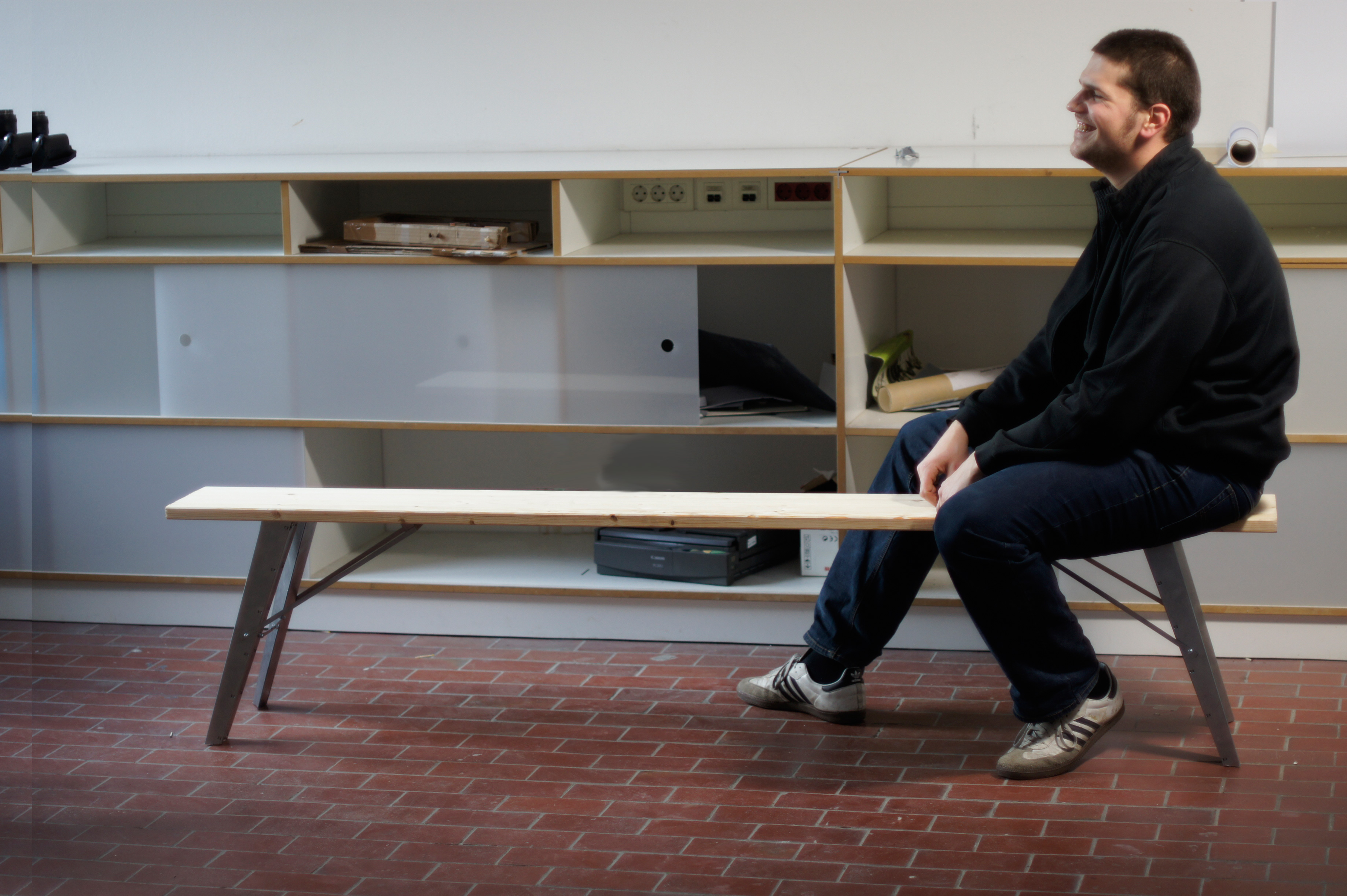 We wanted to enhance the stability so that you can´t tip the bench over if you sit on the far end. We only had 1m² of a 0,75mm thick metal sheet to work with. .First we planned the bench in Illustrator. And than we used the laser to cut the metall sheet. After cutting it we just had to fold it into the three dimensional shape. . . . . . The legs are angled slightly outwards in two directions, to balance the bench.