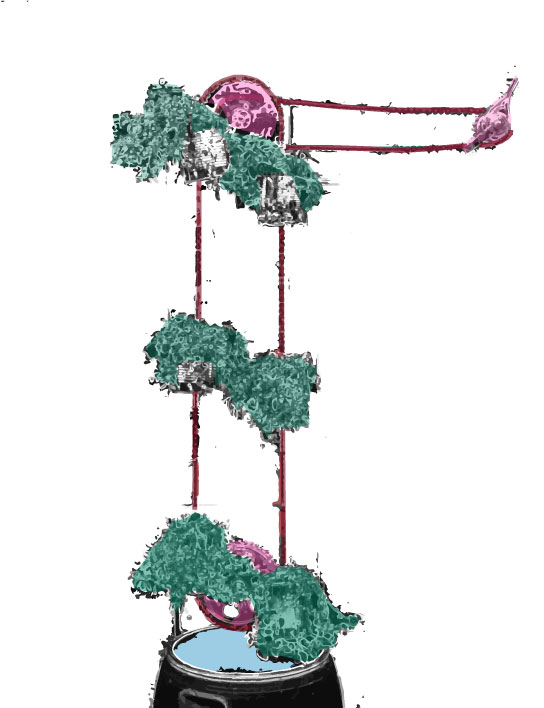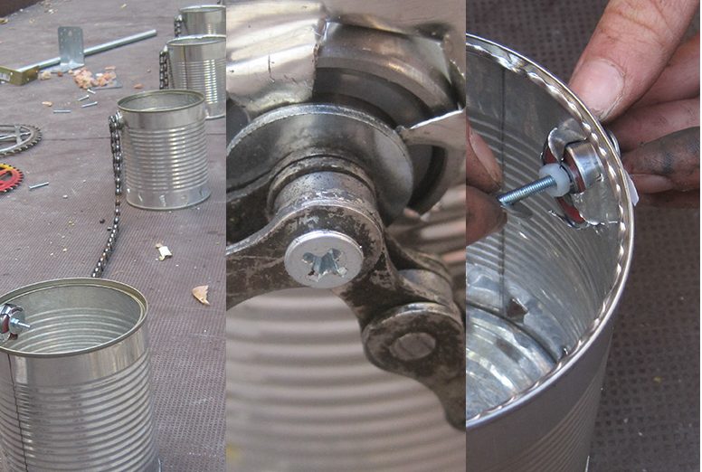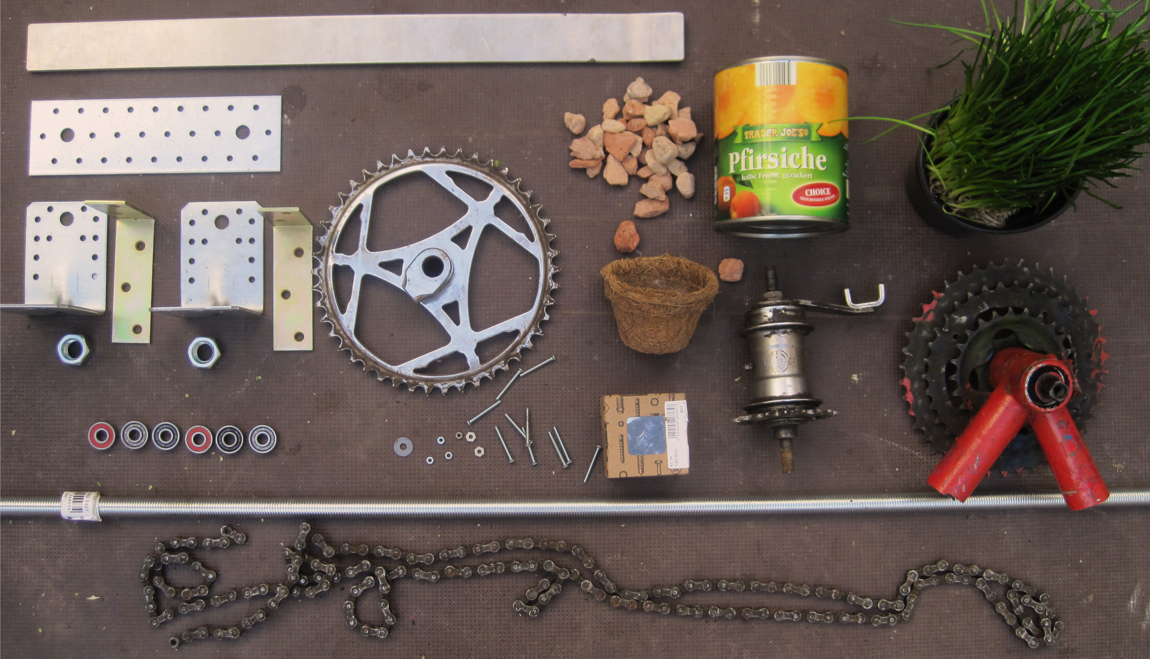 We develop a vertical garden that is rotating, so that you can use the plants which are growing in the vertical. Within the rotation they should water themself. For the up-cycle process we used old bicycle stuff, skateboard rolls and cans to bring them in a new context.